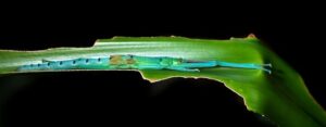 Vive en la nervadura central de la hoja. Cuando detecta un peligro se va hacia la base de ella.