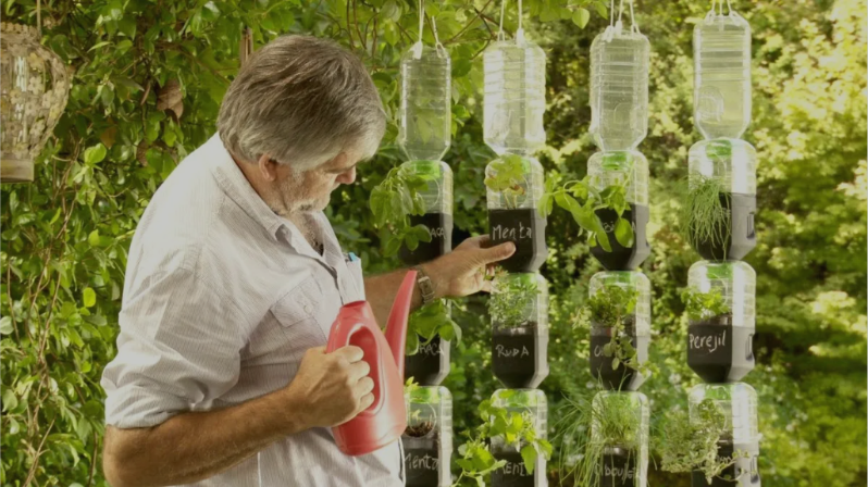 Otra forma es Reutilizando botellas plásticas para los jardines verticales como las de la foto.
